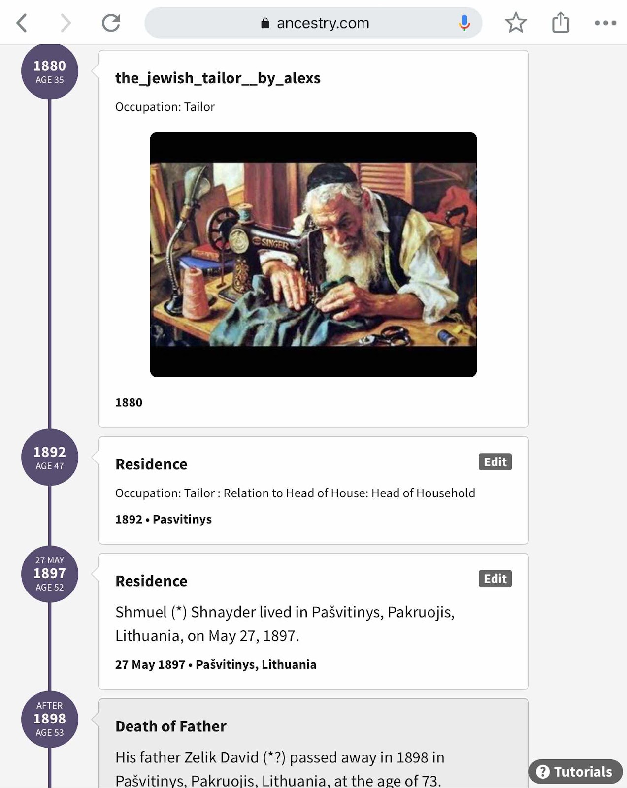 Above is an image I added to my 2nd Great-Grandfather Shmuel SHNAYDER to show his occupation as a Tailor. I added the same image to my Grandfather Mike, his father Yashua, his father Shmuel, his father Zelik David all who census records show were tailors.